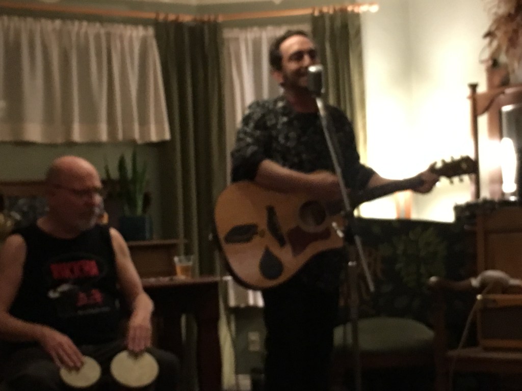 With Andrew Goldfarb (a.k.a. the Slow Poisoner) on guitar and John Skipp on bongos, we were treated to fabulous music, the talents of both on display. When their set finished, cries of “encore” rang out. Garrett Cook approached the musicians and a minute later he was belting out a song in an incredible voice I didn’t know he had.